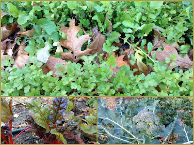Fall broccoli finally sported some heads in October, although I have yet to harvest them. My earlier plantings of arugula, Swiss chard, kale, and cilantro still look lush. We harvested something from the garden every day through October and now into November.
